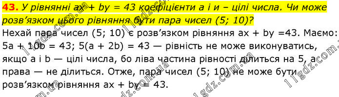 У рівнянні ах + by = 43 коефіцієнти а і и – цілі числа. Чи може розв’язком цього рівняння бути пара чисел (5; 10)? Нехай пара чисел (5; 10) є розв’язком рівняння ах + by =43. Маємо: 5a + 10b = 43; 5(а + 2b) = 43 — рівність не може виконуватись, якщо a і b — цілі числа, бо ліва частина рівності ділиться на 5, а права — не ділиться. Отже, пара чисел (5; 10) не може бути розв’язком рівняння ах + by = 43.