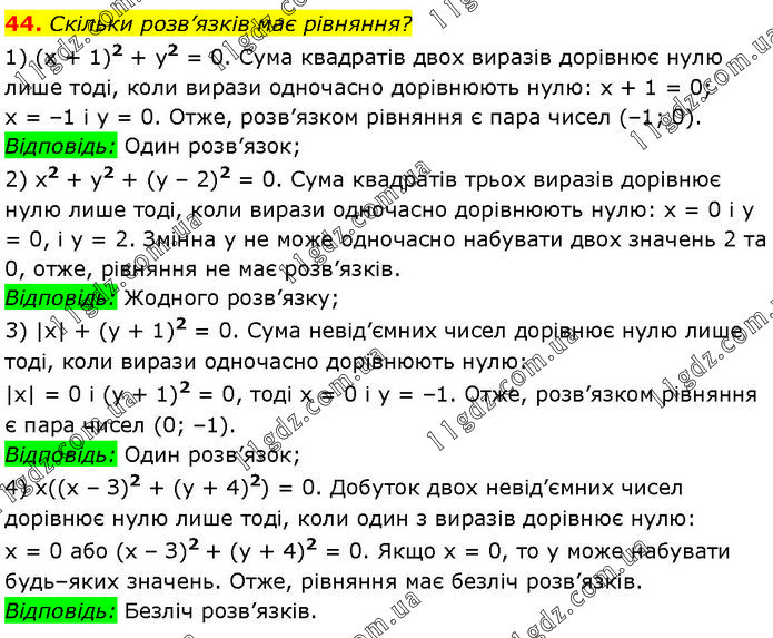 Скільки розв’язків має рівняння? 1) (х + 1)2 + y2 = 0. Сума квадратів двох виразів дорівнює нулю лише тоді, коли вирази одночасно дорівнюють нулю: х + 1 = 0; х = –1 і у = 0. Отже, розв’язком рівняння є пара чисел (–1; 0). Відповідь: Один розв’язок; 2) x2 + у2 + (у – 2)2 = 0. Сума квадратів трьох виразів дорівнює нулю лише тоді, коли вирази одночасно дорівнюють нулю: х = 0 і у = 0, i у = 2. Змінна у не може одночасно набувати двох значень 2 та 0, отже, рівняння не має розв’язків. Відповідь: Жодного розв’язку; 3) |х| + (у + 1)2 = 0. Сума невід’ємних чисел дорівнює нулю лише тоді, коли вирази одночасно дорівнюють нулю: |х| = 0 і (у + 1)2 = 0, тоді х = 0 і у = –1. Отже, розв’язком рівняння є пара чисел (0; –1). Відповідь: Один розв’язок; 4) х((х – З)2 + (у + 4)2) = 0. Добуток двох невід’ємних чисел дорівнює нулю лише тоді, коли один з виразів дорівнює нулю: х = 0 або (х – З)2 + (у + 4)2 = 0. Якщо х = 0, то у може набувати будь–яких значень. Отже, рівняння має безліч розв’язків. Відповідь: Безліч розв’язків.