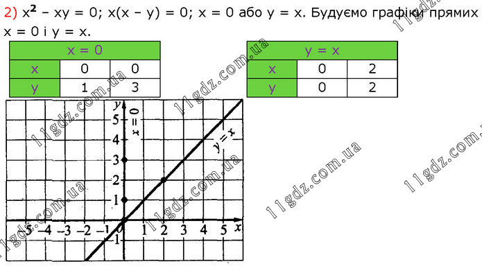 2) х2 – ху = 0; x(x – у) = 0; x = 0 або у = х. Будуємо графіки прямих x = 0 і у = x.