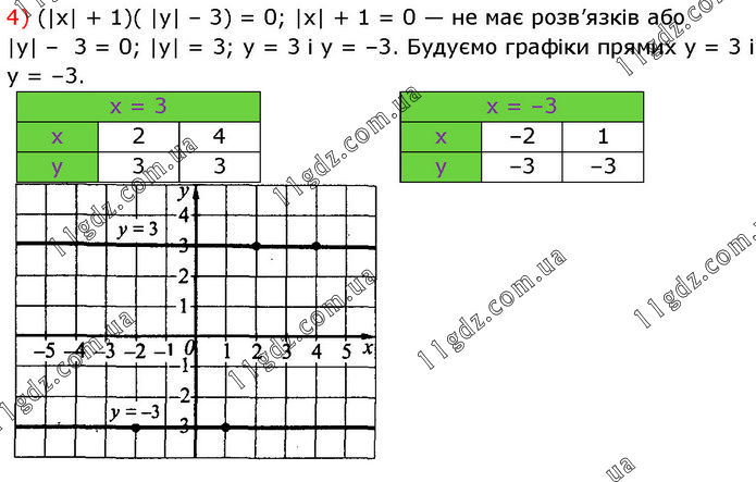 4) (|x| + 1)( |у| – 3) = 0; |x| + 1 = 0 — не має розв’язків або |у| – 3 = 0; |у| = 3; у = 3 i у = –3. Будуємо графіки прямих у = 3 і у = –3.