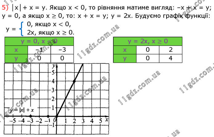 5) │х│+ х = у. Якщо х < 0, то рівняння матиме вигляд: –х + х = у; у = 0, а якщо x ≥ 0, то: x + x = y; y = 2x. Будуємо графік функції:
