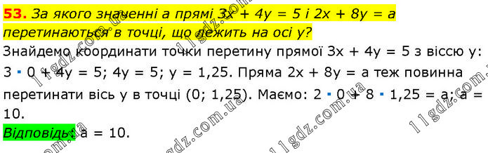 За якого значенні а прямі Зх + 4у = 5 і 2х + 8у = а перетинаються в точці, що лежить на осі у? Знайдемо координати точки перетину прямої Зх + 4у = 5 з віссю у: 3 ∙ 0 + 4у = 5; 4у = 5; у = 1,25. Пряма 2х + 8y = а теж повинна перетинати вісь у в точці (0; 1,25). Маємо: 2 ∙ 0 + 8 ∙ 1,25 = а; а = 10. Відповідь: а = 10.