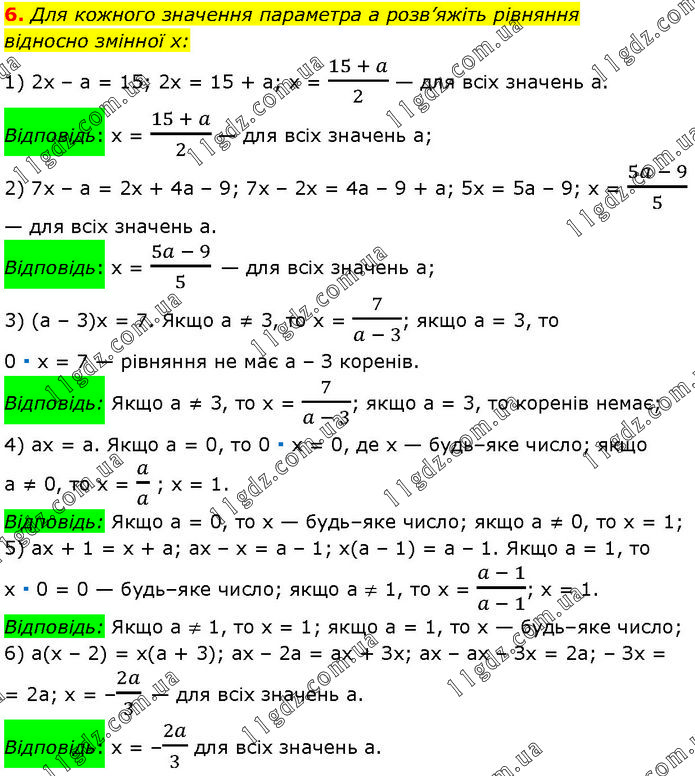 Для кожного значення параметра а розв’яжіть рівняння відносно змінної х: 1) 2х – а = 15; 2х = 15 + а; х = (15 + a)/2 — для всіх значень а. Відповідь: х = (15 + a)/2 — для всіх значень а; 2) 7х – а = 2х + 4а – 9; 7х – 2х = 4а – 9 + а; 5x = 5a – 9; x = (5a - 9)/5 — для всіх значень а. Відповідь: х = (5a - 9)/5 — для всіх значень а; 3) (а – 3)х = 7. Якщо а ≠ 3, то х = 7/(a - 3); якщо а = 3, то 0 ∙ х = 7 — рівняння не має а – З коренів. Відповідь: Якщо а ≠ 3, то х = 7/(a - 3); якщо а = 3, то коренів немає; 4) ах = а. Якщо а = 0, то 0 ∙ х = 0, де х — будь–яке число; якщо а ≠ 0, то х = a/a ; х = 1. Відповідь: Якщо а = 0, то х — будь–яке число; якщо а ≠ 0, то х = 1; 5) ах + 1 = x + а; ax – х = а – 1; х(а – 1) = а – 1. Якщо а = 1, то х ∙ 0 = 0 — будь–яке число; якщо а ≠ 1, то х = (a - 1)/(a - 1); х = 1. Відповідь: Якщо а ≠ 1, то х = 1; якщо а = 1, то х — будь–яке число; 6) а(х – 2) = х(а + 3); ах – 2а = ах + Зх; ах – ах – Зх = 2а; – Зх = 2а; х = –2a/3 — для всіх значень а. Відповідь: х = –2a/3 для всіх значень а.