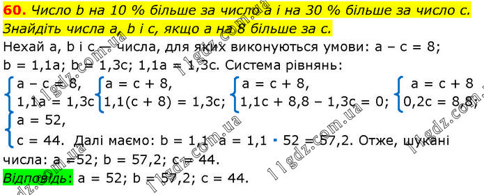 Число b на 10 % більше за число а і на 30 % більше за число с. Знайдіть числа а, b і с, якщо а на 8 більше за с.