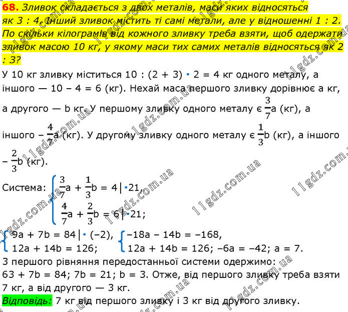 Зливок складається з двох металів, маси яких відносяться як 3 : 4. Інший зливок містить ті самі метали, але у відношенні 1 : 2. По скільки кілограмів від кожного зливку треба взяти, щоб одержати зливок масою 10 кг, у якому маси тих самих металів відносяться як 2 : З? У 10 кг зливку міститься 10 : (2 + 3) ∙ 2 = 4 кг одного металу, а іншого — 10 – 4 = 6 (кг). Нехай маса першого зливку дорівнює а кг, а другого — b кг. У першому зливку одного металу є 3/7а (кг), а іншого – 4/7а (кг). У другому зливку одного металу є 1/3b (кг), а іншого – 2/3b (кг).