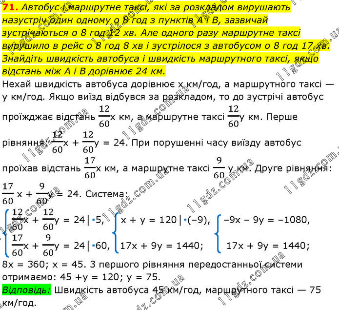 Автобус і маршрутне таксі, які за розкладом вирушають назустріч один одному о 8 год з пунктів A i В, зазвичай зустрічаються о 8 год 12 хв. Але одного разу маршрутне таксі вирушило в рейс о 8 год 8 хв і зустрілося з автобусом о 8 год 17 хв. Знайдіть швидкість автобуса і швидкість маршрутного таксі, якщо відстань між A i B дорівнює 24 км. Нехай швидкість автобуса дорівнює х км/год, а маршрутного таксі — у км/год. Якщо виїзд відбувся за розкладом, то до зустрічі автобус проїжджає відстань 12/60х км, а маршрутне таксі 12/60у км. Перше рівняння: 12/60х + 12/60y = 24. При порушенні часу виїзду автобус проїхав відстань 17/60х км, а маршрутне таксі 9/60 у км. Друге рівняння: 17/60 х + 9/60y = 24. Система: