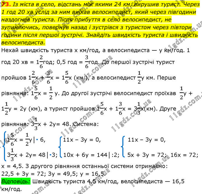 Із міста в село, відстань між якими 24 км, вирушив турист. Через 1 год 20 хв услід за ним виїхав велосипедист, який через півгодини наздогнав туриста. Після прибуття в село велосипедист, не зупиняючись, повернув назад і зустрівся з туристом через півтори години після першої зустрічі. Знайдіть швидкість туриста і швидкість велосипедиста. Нехай швидкість туриста х км/год, а велосипедиста — y км/год. 1 год 20 хв = 12/6год; 0,5 год = 3/6год. До першої зустрічі турист пройшов 12/6х + 3/6x = 15/6х (км.), а велосипедист 1/2y км. Перше рівняння: 15/6х = 1/2 y. До другої зустрічі велосипедист проїхав 1/2y + 11/2y = 2y (км), а турист пройшов 15/6х + 13/6х = 31/3х(км). Друге рівняння: 31/3х + 2y = 48. Система: