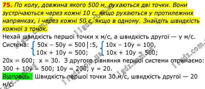 По колу, довжина якого 500 м, рухаються дві точки. Вони зустрічаються через кожні 10 с, якщо рухаються у протилежних напрямках, і через кожні 50 с, якщо в одному. Знайдіть швидкість кожної з точок. Нехай швидкість першої точки х м/с, а швидкість другої — у м/с. Система: 50x – 50y = 500│:5, 10x – 10y = 100, 10x + 10y = 500; 10x + 10y = 500; 20x = 600; x = 30. З другого рівняння першої системи отримаємо: 300 + 10y = 500; 10y = 200; у = 20. Відповідь: Швидкість першої точки 30 м/с, швидкість другої — 20 м/с.