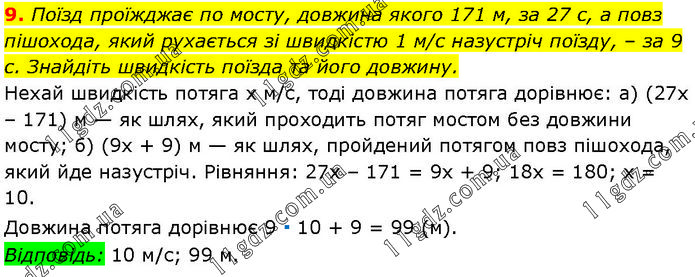 Поїзд проїжджає по мосту, довжина якого 171 м, за 27 с, а повз пішохода, який рухається зі швидкістю 1 м/с назустріч поїзду, – за 9 с. Знайдіть швидкість поїзда та його довжину. Нехай швидкість потяга х м/с, тоді довжина потяга дорівнює: а) (27х – 171) м — як шлях, який проходить потяг мостом без довжини мосту; б) (9х + 9) м — як шлях, пройдений потягом повз пішохода, який йде назустріч. Рівняння: 27х – 171 = 9х + 9; 18х = 180; х = 10. Довжина потяга дорівнює 9 ∙ 10 + 9 = 99 (м). Відповідь: 10 м/с; 99 м.