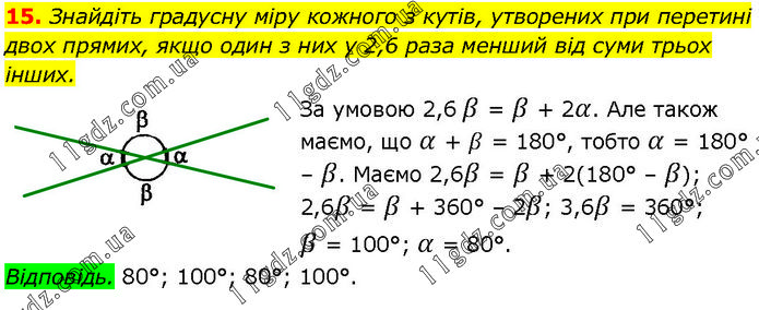 Знайдіть градусну міру кожного з кутів, утворених при перетині двох прямих, якщо один з них у 2,6 раза менший від суми трьох інших. За умовою 2,6 β = β + 2α. Але також маємо, що α + β = 180°, тобто α = 180° – β. Маємо 2,6β = β + 2(180° – β); 2,6β = β + 360° – 2β; 3,6β = 360°; β = 100°; α = 80°. Відповідь. 80°; 100°; 80°; 100°.