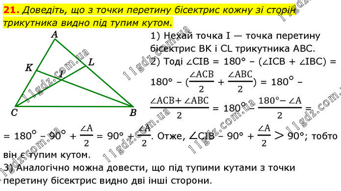 Доведіть, що з точки перетину бісектрис кожну зі сторін трикутника видно під тупим кутом. 1) Нехай точка І — точка перетину бісектрис BK і CL трикутника ABC. 2) Тоді ∠CIB = 180° – (∠ICB + ∠ІBС) = 180° – ((∠АСВ)/2 + (∠АВС)/2) = 180° – (∠АСВ+ ∠АВС)/2 = 180° – (180°- ∠А)/2 = 180° – 90° + (∠А)/2 = 90° + (∠А)/2. Отже, ∠CIB – 90° + (∠А)/2 > 90°; тобто він є тупим кутом. 3) Аналогічно можна довести, що під тупими кутами з точки перетину бісектрис видно дві інші сторони.