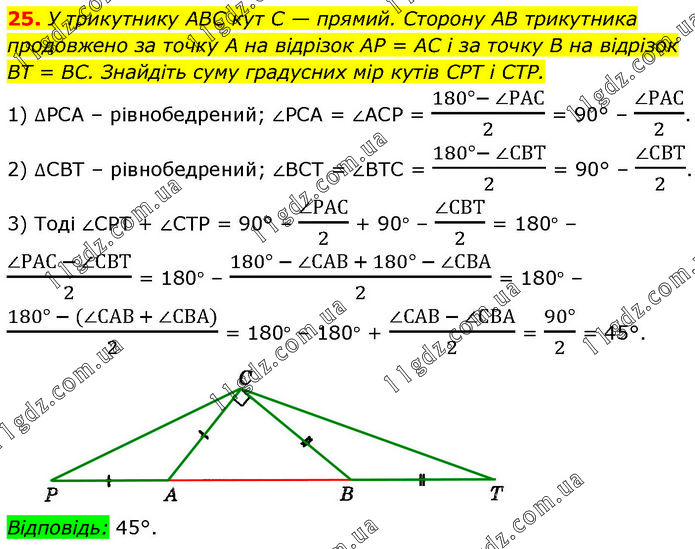 У трикутнику ABC кут C — прямий. Сторону AB трикутника продовжено за точку А на відрізок AP = AC і за точку В на відрізок BT = BC. Знайдіть суму градусних мір кутів CPT і CTP. 1) ∆РСА – рівнобедрений; ∠РСА = ∠АСР = (180°- ∠РАС)/2 = 90° – (∠РАС)/2. 2) ∆СВТ – рівнобедрений; ∠ВСТ = ∠ВТС = (180°- ∠СВТ)/2 = 90° – (∠СВТ)/2. 3) Тоді ∠СРТ + ∠СТР = 90° – (∠РАС)/2 + 90° – (∠СВТ)/2 = 180° – (∠РАС - ∠СВТ)/2 = 180° – (180° - ∠САВ + 180° - ∠СВА)/2 = 180° – (180° - (∠САВ + ∠СВА))/2 = 180° – 180° + (∠САВ - ∠СВА)/2 = (90°)/2 = 45°. Відповідь: 45°.