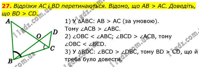 27. Відрізки AC і BD перетинаються. Відомо, що AB > АС. Доведіть, що BD > CD. 1) У ∆ABC: AB > AC (за умовою). Тому ∠ACB > ∠ABC. 2) ∠OBC < ∠ABC; ∠BCD > ∠ACB, тому ∠OBC < ∠BCD. 3) У ∆BDC: ∠BCD > ∠DBC, тому BD > CD, що й треба було довести.