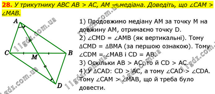 У трикутнику ABC AB > AC, AM — медіана. Доведіть, що ∠САМ > ∠МАВ. 1) Продовжимо медіану AM за точку M на довжину AM, отримаємо точку D. 2) ∠CMD = ∠AMB (як вертикальні). Тому ∆CMD = ∆BMA (за першою ознакою). Тому ∠CDM = ∠MAB i CD = AB. 3) Оскільки AB > АС, то й CD > АС. 4) У ∆CAD: CD > АС, а тому ∠CAD > ∠CDA. Тому ∠CAM > ∠MAB, що й треба було довести.