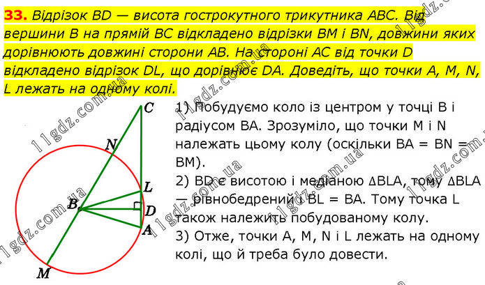 Відрізок BD — висота гострокутного трикутника ABC. Від вершини В на прямій BC відкладено відрізки BM і BN, довжини яких дорівнюють довжині сторони AB. На стороні AC від точки D відкладено відрізок DL, що дорівнює DA. Доведіть, що точки А, М, N, L лежать на одному колі. 1) Побудуємо коло із центром у точці В і радіусом BA. Зрозуміло, що точки M і N належать цьому колу (оскільки BA = BN = BM). 2) BD є висотою і медіаною ∆BLA, тому ∆BLA — рівнобедрений і BL = BA. Тому точка L також належить побудованому колу. 3) Отже, точки А, М, N і L лежать на одному колі, що й треба було довести.