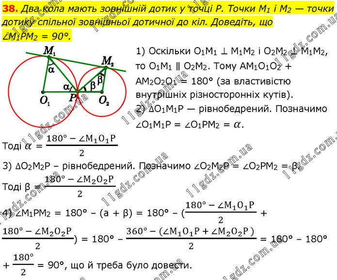 Два кола мають зовнішній дотик у точці Р. Точки M1 і M2 — точки дотику спільної зовнішньої дотичної до кіл. Доведіть, що ∠M1PM2 = 90°. 1) Оскільки O1M1 ⊥ M1M2 і O2M2 ⊥ M1M2, то O1M1 ∥ O2M2. Тому AM1O1O2 + AM2O2O1 = 180° (за властивістю внутрішніх різносторонніх кутів). 2) ∆O1M1P — рівнобедрений. Позначимо ∠O1M1P = ∠O1PM2 = α. Тоді α = (180° - ∠М_1 О_1 Р )/2; 3) ∆O2M2P – рівнобедрений. Позначимо ∠O2M2P = ∠O2PM2 = β. Тоді β = (180° - ∠М_2 О_2 Р )/2; 4) ∠M1PM2 = 180° – (а + β) = 180° – ((180° - ∠М_1 О_1 Р )/2 + (180° - ∠М_2 О_2 Р )/2) = 180° – (360° - (∠М_1 О_1 Р + ∠М_2 О_2 Р ) )/2 = 180° – 180° + (180°)/2 = 90°, що й треба було довести.