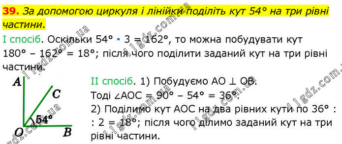 За допомогою циркуля і лінійки поділіть кут 54° на три рівні частини. І спосіб. Оскільки 54° ∙ 3 = 162°, то можна побудувати кут 180° – 162° = 18°; після чого поділити заданий кут на три рівні частини. II спосіб. 1) Побудуємо AO ⊥ OB. Тоді ∠АОС = 90° – 54° = 36°. 2) Поділимо кут AOC на два рівних кути по 36° : 2 = 18°; після чого ділимо заданий кут на три рівні частини.