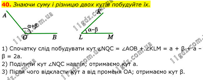 Знаючи суму і різницю двох кутів побудуйте їх. 1) Спочатку слід побудувати кут ∠NQC = ∠AOB + ∠KLM = а + β + а – β = 2а. 2) Поділити кут ∠NQC навпіл; отримаємо кут a. 3) Після чого відкласти кут а від променя OA; отримаємо кут β.