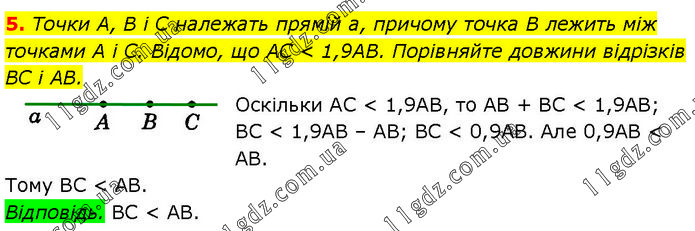Точки A, B i C належать прямій а, причому точка В лежить між точками А і С. Відомо, що AC < 1,9AB. Порівняйте довжини відрізків BC і AB. Оскільки AC < 1,9AB, то AB + BC < 1,9АВ; BC < 1,9AB – AB; BC < 0,9AB. Але 0,9AB < AB. Тому BC < AB. Відповідь. BC < AB.