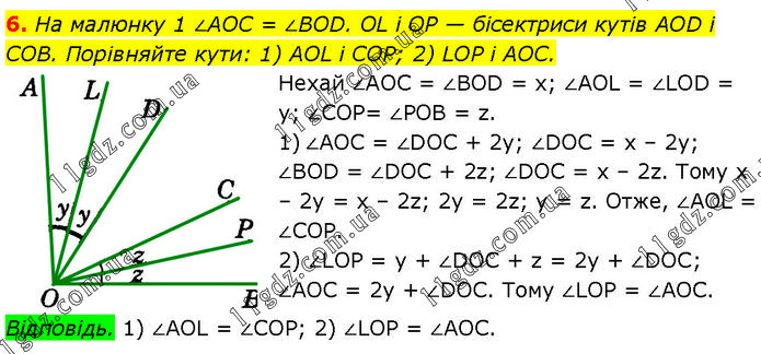 На малюнку 1 ∠AOC = ∠BOD. OL і OP — бісектриси кутів AOD і СОВ. Порівняйте кути: 1) AOL і COP; 2) LOP і AOC. Нехай ∠AOC = ∠BOD = х; ∠AOL = ∠LOD = у; ∠COP = ∠POB = z. 1) ∠AOC = ∠DOC + 2у; ∠DOC = х – 2у; ∠BOD = ∠DOC + 2z; ∠DOC = х – 2z. Тому х – 2у = x – 2z; 2y = 2z; y = z. Отже, ∠AOL = ∠COP. 2) ∠LOP = у + ∠DOC + z = 2y + ∠DOC; ∠AOC = 2y + ∠DOC. Тому ∠LOP = ∠AOC. Відповідь. 1) ∠AOL = ∠COP; 2) ∠LOP = ∠AOC.