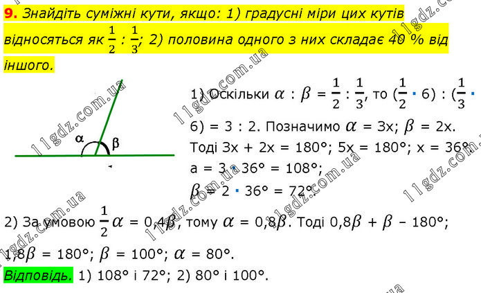 Знайдіть суміжні кути, якщо: 1) градусні міри цих кутів відносяться як 1/2 : 1/3; 2) половина одного з них складає 40 % від іншого. 1) Оскільки α : β = 1/2 : 1/3, то (1/2 ∙ 6) : (1/3 ∙ 6) = 3 : 2. Позначимо α = Зх; β = 2х. Тоді Зх + 2х = 180°; 5х = 180°; х = 36°. а = 3 ∙ 36° = 108°; β = 2 ∙ 36° = 72°. 2) За умовою 1/2 α = 0,4β, тому α = 0,8β. Тоді 0,8β + β – 180°; 1,8β = 180°; β = 100°; α = 80°. Відповідь. 1) 108° і 72°; 2) 80° і 100°.