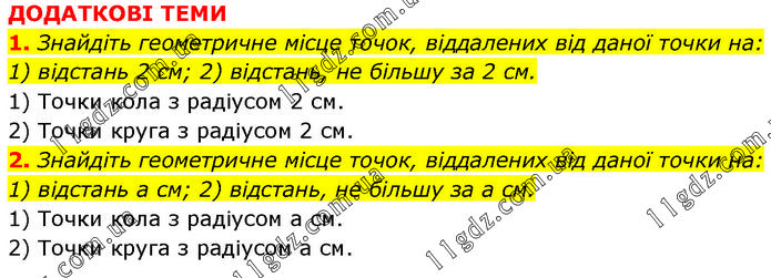 ДОДАТКОВІ ТЕМИ 1. Знайдіть геометричне місце точок, віддалених від даної точки на: 1) відстань 2 см; 2) відстань, не більшу за 2 см. 1) Точки кола з радіусом 2 см. 2) Точки круга з радіусом 2 см. 2. Знайдіть геометричне місце точок, віддалених від даної точки на: 1) відстань а см; 2) відстань, не більшу за а см. 1) Точки кола з радіусом а см. 2) Точки круга з радіусом а см.