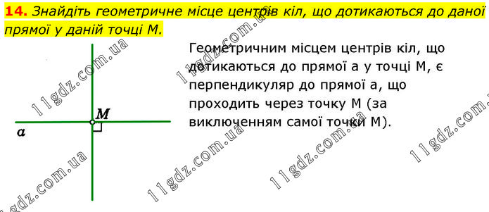 Знайдіть геометричне місце центрів кіл, що дотикаються до даної прямої у даній точці М. Геометричним місцем центрів кіл, що дотикаються до прямої а у точці М, є перпендикуляр до прямої а, що проходить через точку M (за виключенням самої точки М).