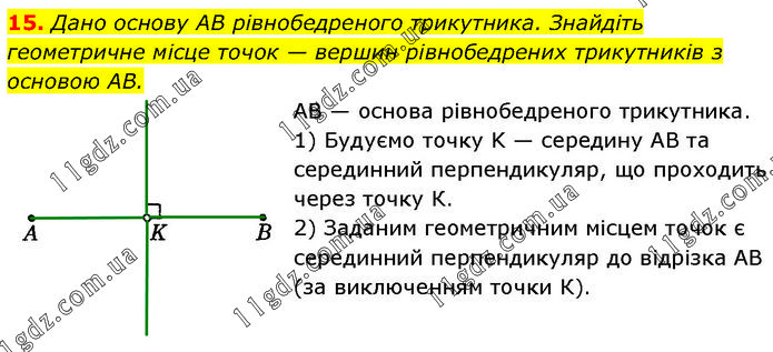 Дано основу AB рівнобедреного трикутника. Знайдіть геометричне місце точок — вершин рівнобедрених трикутників з основою AB. AB — основа рівнобедреного трикутника. 1) Будуємо точку K — середину AB та серединний перпендикуляр, що проходить через точку К. 2) Заданим геометричним місцем точок є серединний перпендикуляр до відрізка AB (за виключенням точки К).