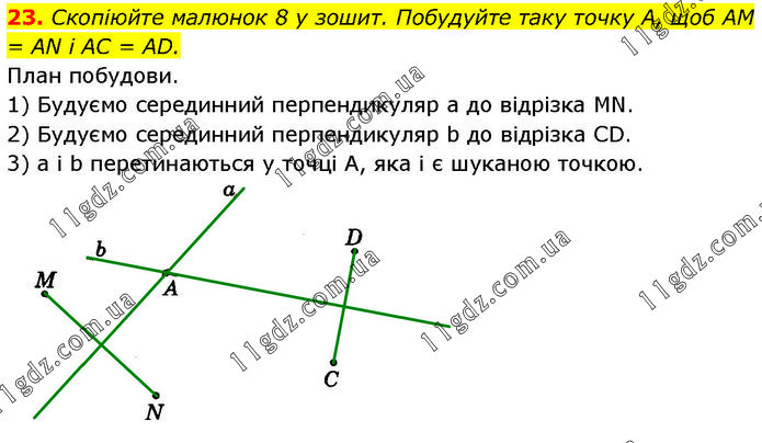 Скопіюйте малюнок 8 у зошит. Побудуйте таку точку А, щоб AM = AN і AC = AD. План побудови. 1) Будуємо серединний перпендикуляр а до відрізка MN. 2) Будуємо серединний перпендикуляр b до відрізка CD. 3) a і b перетинаються у точці А, яка і є шуканою точкою.