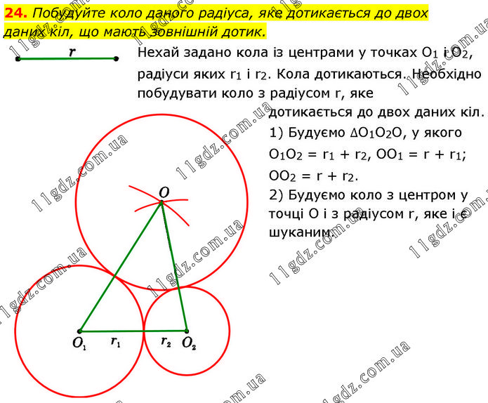 Побудуйте коло даного радіуса, яке дотикається до двох даних кіл, що мають зовнішній дотик. Нехай задано кола із центрами у точках O1 і O2, радіуси яких r1 і r2. Кола дотикаються. Необхідно побудувати коло з радіусом r, яке дотикається до двох даних кіл. 1) Будуємо ∆O1O2O, у якого O1O2 = r1 + r2, OO1 = r + r1; OO2 = r + r2. 2) Будуємо коло з центром у точці O і з радіусом r, яке і є шуканим.
