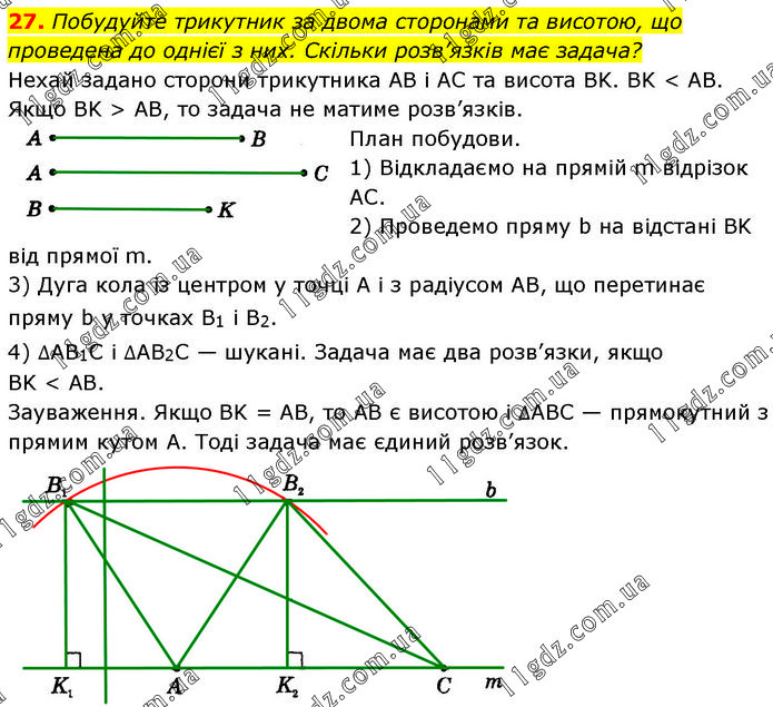 Побудуйте трикутник за двома сторонами та висотою, що проведена до однієї з них. Скільки розв’язків має задача? Нехай задано сторони трикутника AB і AC та висота BK. BK < AB. Якщо BK > AB, то задача не матиме розв’язків. План побудови. 1) Відкладаємо на прямій m відрізок АС. 2) Проведемо пряму b на відстані BK від прямої m. 3) Дуга кола із центром у точці А і з радіусом AB, що перетинає пряму b у точках B1 і B2. 4) ∆AB1C і ∆AB2C — шукані. Задача має два розв’язки, якщо BK < AB. Зауваження. Якщо BK = AB, то AB є висотою і ∆ABC — прямокутний з прямим кутом А. Тоді задача має єдиний розв’язок.