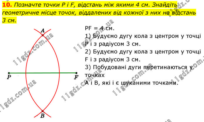Позначте точки P і F, відстань між якими 4 см. Знайдіть геометричне місце точок, віддалених від кожної з них на відстань 3 см. PF = 4 см. 1) Будуємо дугу кола з центром у точці P і з радіусом 3 см. 2) Будуємо дугу кола з центром у точці F і з радіусом 3 см. 3) Побудовані дуги перетинаються у точках A і B, які і є шуканими точками.