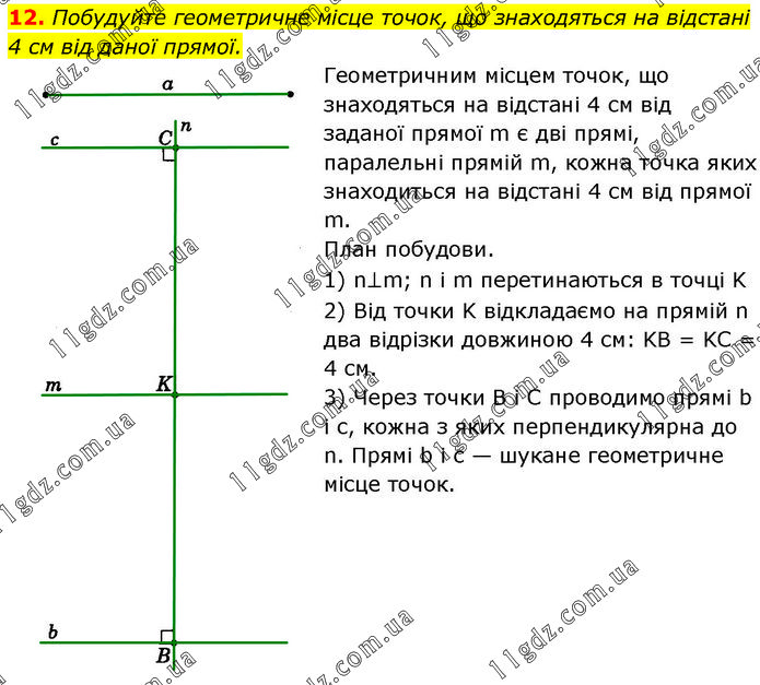 Побудуйте геометричне місце точок, що знаходяться на відстані 4 см від даної прямої. Геометричним місцем точок, що знаходяться на відстані 4 см від заданої прямої m є дві прямі, паралельні прямій m, кожна точка яких знаходиться на відстані 4 см від прямої m. План побудови. 1) n⊥m; n і m перетинаються в точці K 2) Від точки K відкладаємо на прямій n два відрізки довжиною 4 см: KB = KC = 4 см. 3) Через точки B і C проводимо прямі b і с, кожна з яких перпендикулярна до n. Прямі b і с — шукане геометричне місце точок.