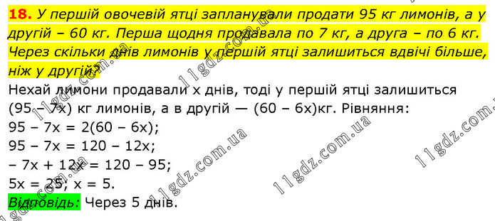 У першій овочевій ятці запланували продати 95 кг лимонів, а у другій – 60 кг. Перша щодня продавала по 7 кг, а друга – по 6 кг. Через скільки днів лимонів у першій ятці залишиться вдвічі більше, ніж у другій? Нехай лимони продавали х днів, тоді у першій ятці залишиться (95 – 7х) кг лимонів, а в другій — (60 – 6х)кг. Рівняння: 95 – 7х = 2(60 – 6х); 95 – 7x = 120 – 12х; – 7x + 12х = 120 – 95; 5х = 25; х = 5. Відповідь: Через 5 днів.