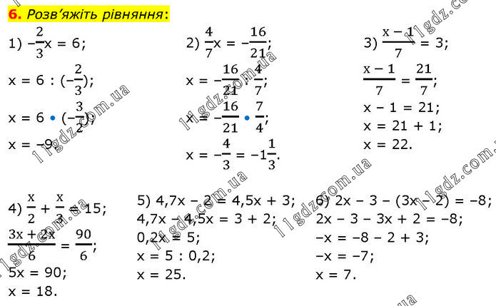 Розв’яжіть рівняння: 1) –2/3х = 6; х = 6 : (–2/3); х = 6 • (–3/2); х = –9. 2) 4/7х = –16/21; х = –16/21 : 4/7; х = –16/21 • 7/4; х = –4/3 = –11/3. 3) (х - 1)/7 = 3; (х - 1)/7 = 21/7; х – 1 = 21; х = 21 + 1; х = 22. 4) х/2 + х/3 = 15; (3х + 2х)/6 = 90/6; 5х = 90; х = 18. 5) 4,7х – 2 = 4,5х + 3; 4,7х – 4,5х = 3 + 2; 0,2х = 5; х = 5 : 0,2; х = 25. 6) 2х – 3 – (3х – 2) = –8; 2х – 3 – 3х + 2 = –8; –х = –8 – 2 + 3; –х = –7; х = 7.