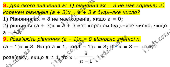 8. Для якого значення а: 1) рівняння ах = 8 не має коренів; 2) коренем рівняння (а + 3)x = а + 3 є будь–яке число? 1) Рівняння ах = 8 не має коренів, якщо а = 0; 2) рівняння (а + 3)х = а + 3 має коренем будь–яке число, якщо а = –3. 9. Розв’яжіть рівняння (а – 1)x = 8 відносно змінної x. (a – 1)x = 8. Якщо а = 1, то (1 – 1)х = 8; 0 ∙ х = 8 — не має розв’язку; якщо а ≠ 1, то х = 8/(a - 1).