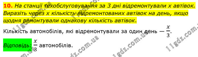 На станції техобслуговування за 3 дні відремонтували х автівок. Виразіть через х кількість відремонтованих автівок на день, якщо щодня ремонтували однакову кількість автівок. Кількість автомобілів, які відремонтували за один день — x/3. Відповідь: x/3 автомобілів.