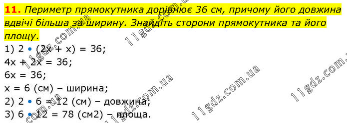 Периметр прямокутника дорівнює 36 см, причому його довжина вдвічі більша за ширину. Знайдіть сторони прямокутника та його площу. 1) 2 • (2х + х) = 36; 4х + 2х = 36; 6х = 36; х = 6 (см) – ширина; 2) 2 • 6 = 12 (см) – довжина; 3) 6 • 12 = 78 (см2) – площа.