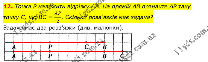 Точка P належить відрізку AB. На прямій AB позначте AP таку точку С, що BC = AP/2. Скільки розв’язків має задача? Задача має два розв’язки (див. малюнки).