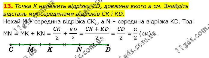 Точка K належить відрізку CD, довжина якого а см. Знайдіть відстань між серединами відрізків CK і KD. Нехай М – середина відрізка СК;, а N – середина відрізка KD. Тоді MN = MK + KN = CK/2 + KD/2 = (CK + KD)/2 = CD/2 = a/2 (см).