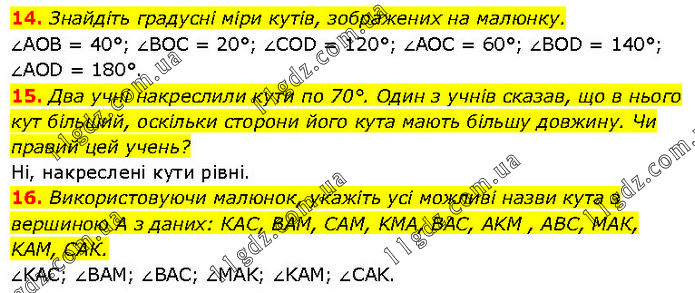 14. Знайдіть градусні міри кутів, зображених на малюнку. ∠AOB = 40°; ∠BOC = 20°; ∠COD = 120°; ∠AOC = 60°; ∠BOD = 140°; ∠AOD = 180°. 15. Два учні накреслили кути по 70°. Один з учнів сказав, що в нього кут більший, оскільки сторони його кута мають більшу довжину. Чи правий цей учень? Ні, накреслені кути рівні. 16. Використовуючи малюнок, укажіть усі можливі назви кута з вершиною А з даних: КАС, ВАМ, САМ, KMA, ВАС, AKM , ABC, МАК, KAM, САК. ∠KAC; ∠BAM; ∠BAC; ∠MAK; ∠KAM; ∠CAK.