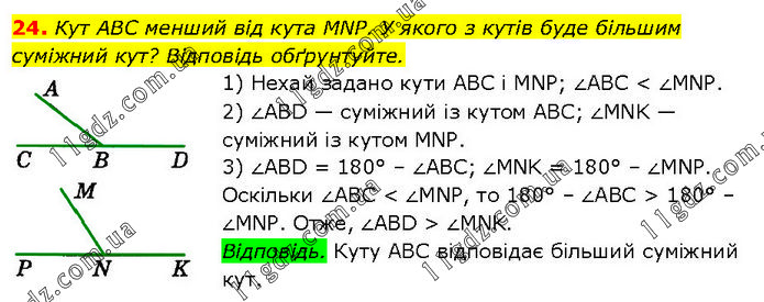 Кут ABC менший від кута MNP. У якого з кутів буде більшим суміжний кут? Відповідь обґрунтуйте. 1) Нехай задано кути ABC і MNP; ∠ABC < ∠MNP. 2) ∠ABD — суміжний із кутом ABC; ∠MNK — суміжний із кутом MNP. 3) ∠ABD = 180° – ∠ABC; ∠MNK = 180° – ∠MNP. Оскільки ∠ABC < ∠MNP, то 180° – ∠ABC > 180° – ∠MNP. Отже, ∠ABD > ∠MNK. Відповідь. Куту ABC відповідає більший суміжний кут.