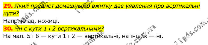 29. Який предмет домашнього вжитку дає уявлення про вертикальні кути? Наприклад, ножиці. 30. Чи є кути 1 і 2 вертикальними? На мал. 5 і 8 — кути 1 і 2 — вертикальні, на інших — ні.