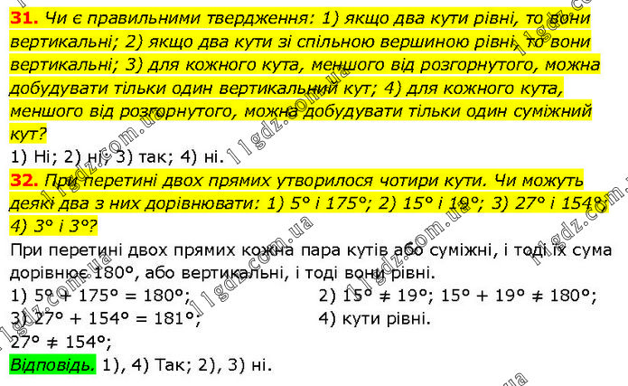 31. Чи є правильними твердження: 1) якщо два кути рівні, то вони вертикальні; 2) якщо два кути зі спільною вершиною рівні, то вони вертикальні; 3) для кожного кута, меншого від розгорнутого, можна добудувати тільки один вертикальний кут; 4) для кожного кута, меншого від розгорнутого, можна добудувати тільки один суміжний кут? 1) Ні; 2) ні; 3) так; 4) ні. 32. При перетині двох прямих утворилося чотири кути. Чи можуть деякі два з них дорівнювати: 1) 5° і 175°; 2) 15° і 19°; 3) 27° і 154°; 4) 3° і 3°? При перетині двох прямих кожна пара кутів або суміжні, і тоді їх сума дорівнює 180°, або вертикальні, і тоді вони рівні. 1) 5° + 175° = 180°; 3) 27° + 154° = 181°; 27° ≠ 154°; 2) 15° ≠ 19°; 15° + 19° ≠ 180°; 4) кути рівні. Відповідь. 1), 4) Так; 2), 3) ні.