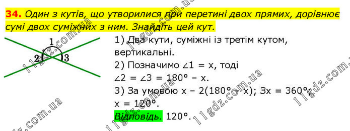 Один з кутів, що утворилися при перетині двох прямих, дорівнює сумі двох суміжних з ним. Знайдіть цей кут. 1) Два кути, суміжні із третім кутом, вертикальні. 2) Позначимо ∠1 = х, тоді ∠2 = ∠3 = 180° – х. 3) За умовою х – 2(180° – х); Зх = 360°; х = 120°. Відповідь. 120°.