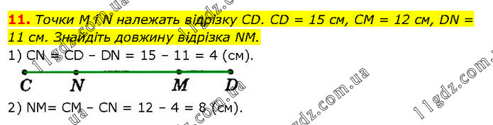 Точки M і N належать відрізку CD. CD = 15 см, CM = 12 см, DN = 11 см. Знайдіть довжину відрізка NM. 1) CN = CD – DN = 15 – 11 = 4 (см). 2) NM= CM – CN = 12 – 4 = 8 (см).