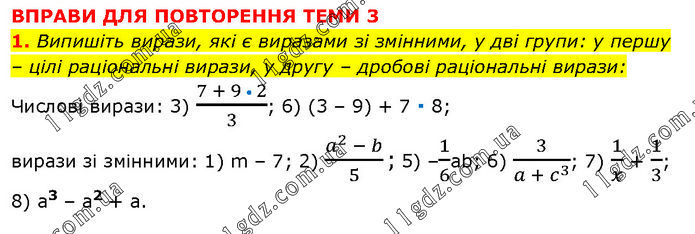 Випишіть вирази, які є виразами зі змінними, у дві групи: у першу – цілі раціональні вирази, у другу – дробові раціональні вирази: Числові вирази: 3) (7 + 9 • 2)/3; 6) (3 – 9) + 7 ∙ 8; вирази зі змінними: 1) m – 7; 2) (a^2 - b)/5; 5) –1/6ab; 6) 3/(a +〖 c〗^3 ); 7) 1/x + 1/3; 8) a3 – a2 + a.
