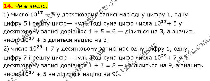 Чи є число: 1) Число 1017 + 5 у десятковому записі має одну цифру 1, одну цифру 5 і решту цифр— нулі. Тоді сума цифр числа 1017+ 5 у десятковому записі дорівнює 1 + 5 = 6 — ділиться на 3, а значить число 1017 + 5 ділиться націло на 3; 2) число 1029 + 7 у десятковому записі має одну цифру 1, одну цифру 7 і решту цифр— нулі. Тоді сума цифр числа 1029+ 7 у десятковому записі дорівнює 1 + 7 = 8 — не ділиться на 9, а значить число 1017 + 5 не ділиться націло на 9.