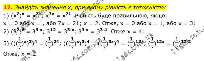 Знайдіть значення х, при якому рівність є тотожністю: 1) (x7)x = x21; x7x = x21. Рівність буде правильною, якщо: х = 0 або х = , або 7х = 21; х = 2. Отже, х = 0 або х = 1, або х = 3; 2) (З2)6 = З3∙x; З12 = З3∙x; З3∙x = З3∙4. Отже х = 4; 3) (((1/7)x)3)4 = (1/7)24; (((1/7)x)3)4 = ((1/7)3x)4 = (1/7)12x; (1/7)12x = (1/7)12∙2 Отже, х = 2.