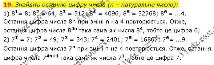 Знайдіть останню цифру числа (n – натуральне число): 1) 81= 8; 82 = 64; 83 = 512; 84 = 4096; 85 = 32768; 86 = ...4. Остання цифра числа 8n при зміні n на 4 повторюється. Отже, остання цифра числа 84n така сама як числа 84, тобто це цифра 6; 2) 71 = 7; 72 = 49; 73 = 343; 74 = 2401; 75 = 16807; 76= ...9. Остання цифра числа 7n при зміні n на 4 повторюється. Отже, остання цифра числа 74n+1 така сама як числа 71, тобто це цифра 7.
